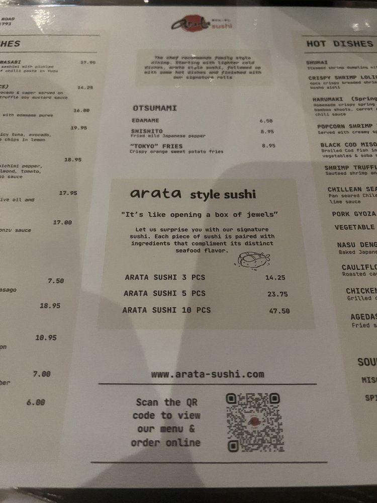 With delivery, takeout, and even outdoor seating, Arata Sushi offers an experience for everyone, making it a perfect spot for family dinners and gatherings.